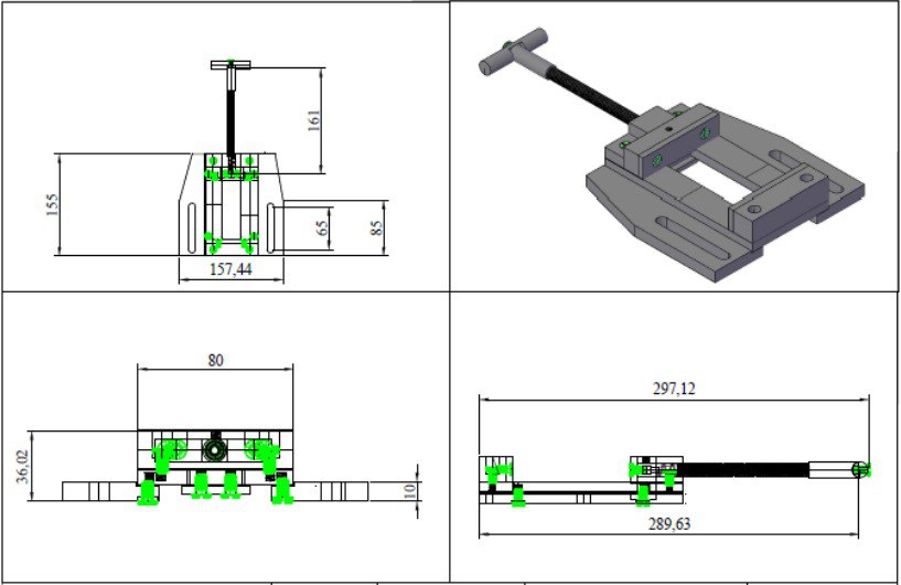 The right-angle vise and machine vise drawings highlight my proficiency in 2D technical drawing, including dimensioning, orthographic projections, and creating detailed plans with accurate measurements.